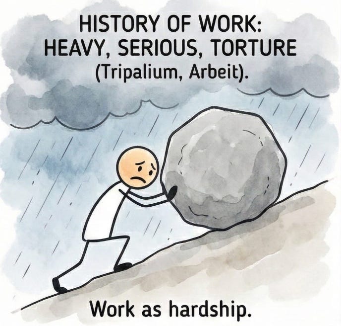 Em alemão, Arbeit vem do alto-alemão antigo arabeit, que significa sofrimento e privação.