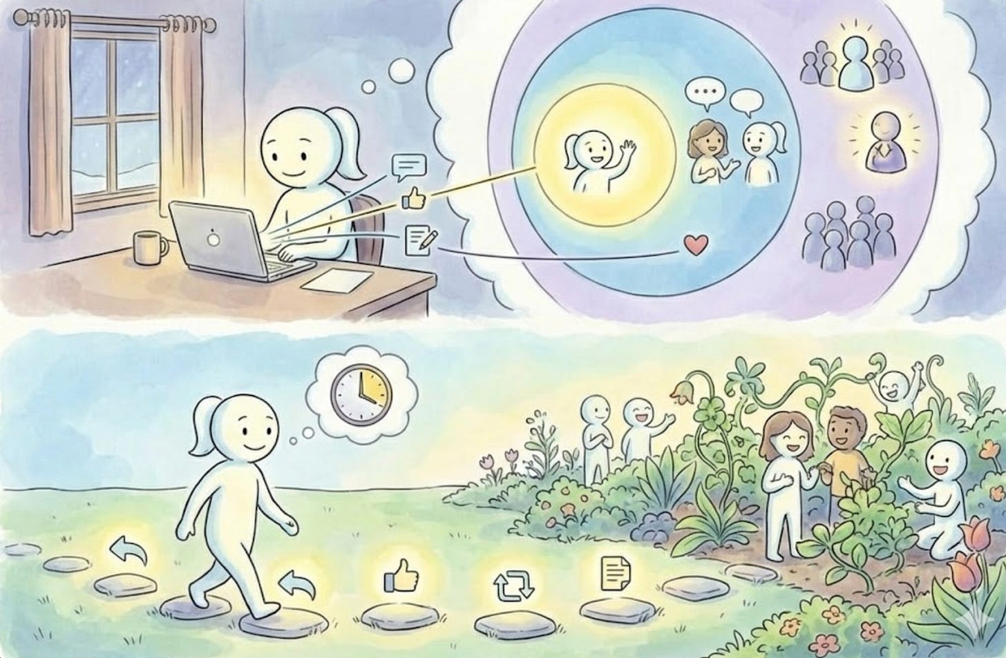 Aqui tá a versão curta: 15 a 20 minutos por dia. Três camadas de engajamento. Trate como se estivesse limpando sua caixa de entrada. Aí fecha o Substack e volta pra sua vida de verdade.
