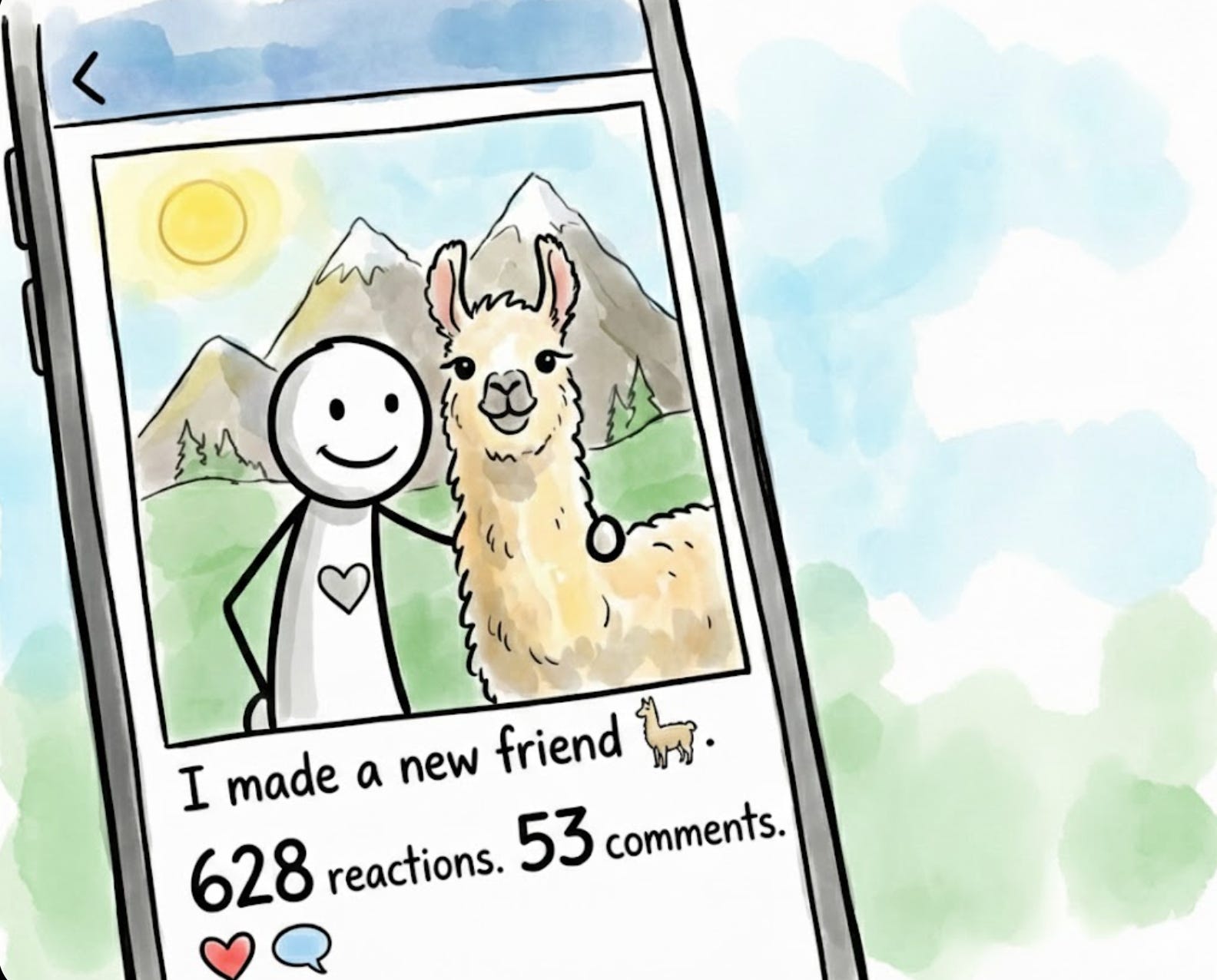 Carolina Wilke a postou uma foto de uma llama que ela conheceu no Peru. “Fiz um novo amigo 🦙.” Só isso.