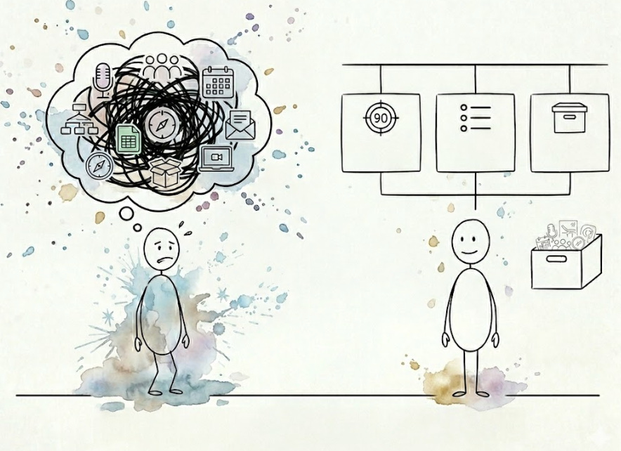 Essa combinação cria um problema específico: de perto, toda ideia nova parece igualmente importante.